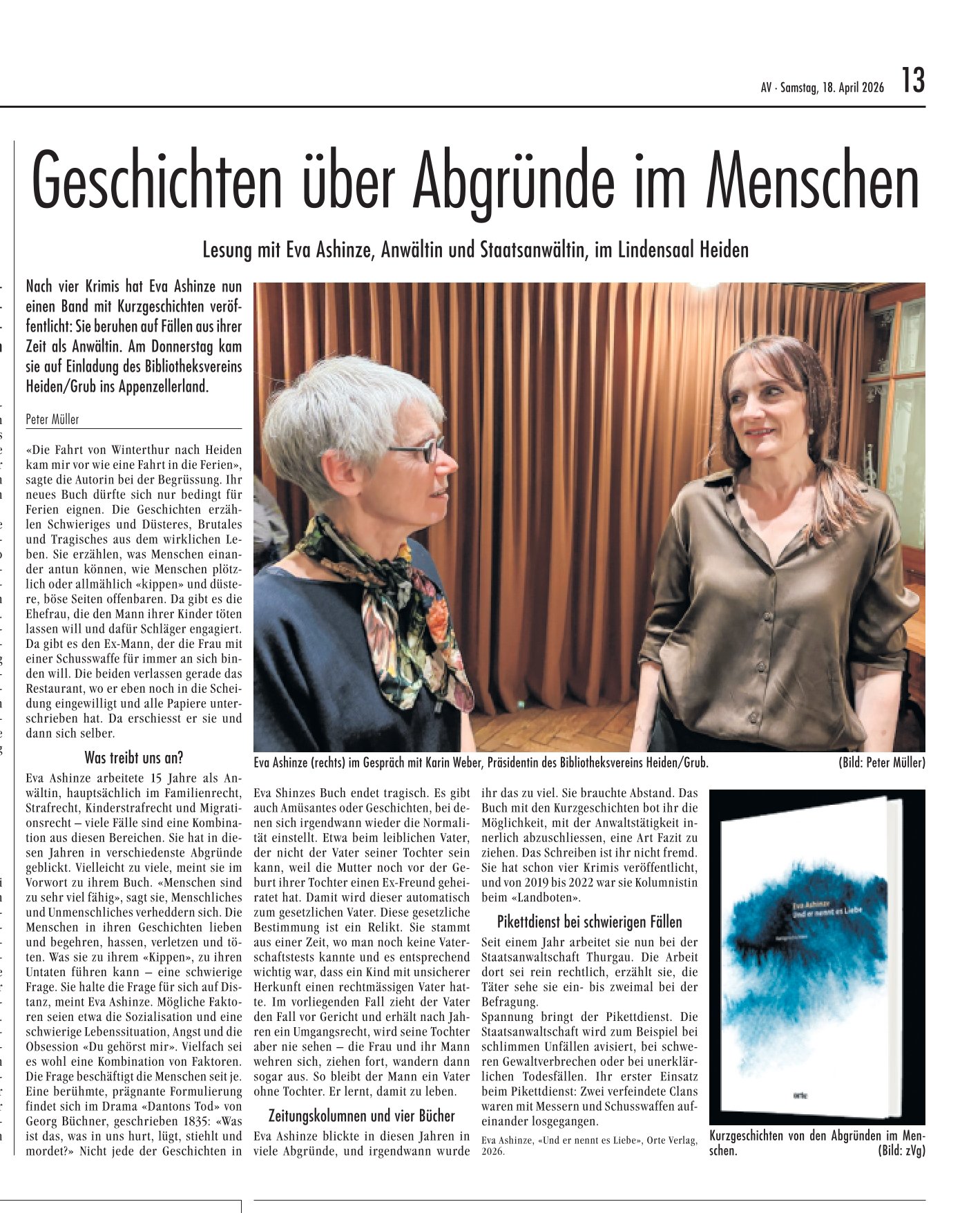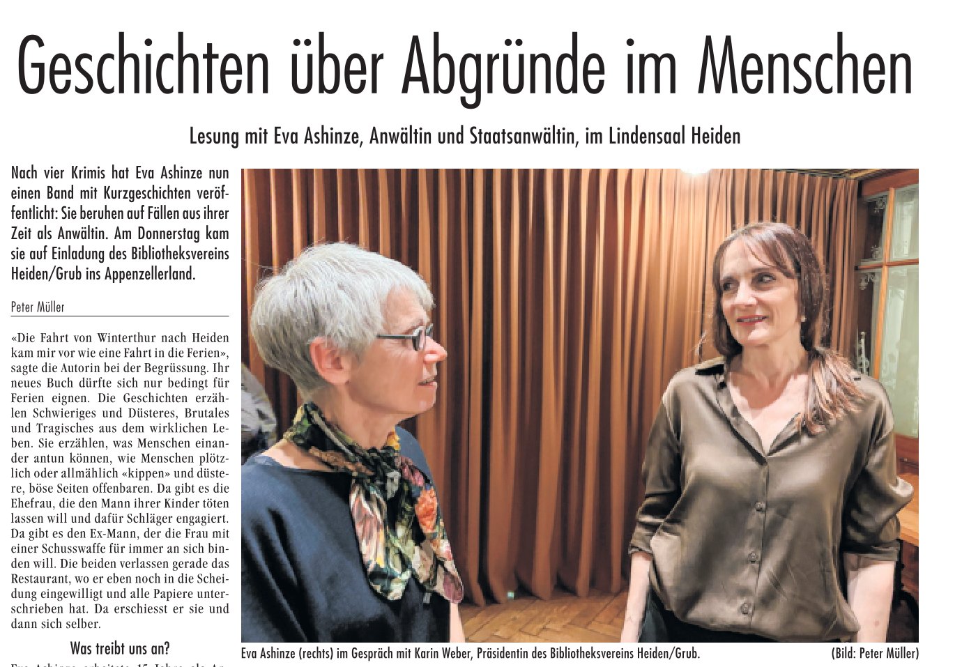 Von Eva Ashinze sind bisher fünf Bücher erschienen. Für «Winterthur 1937» hat sie einen Werkbeitrag Literatur der Stadt Winterthur erhalten. «Winterthur 1937» war zudem für den Zürcher Krimipreis nominiert.